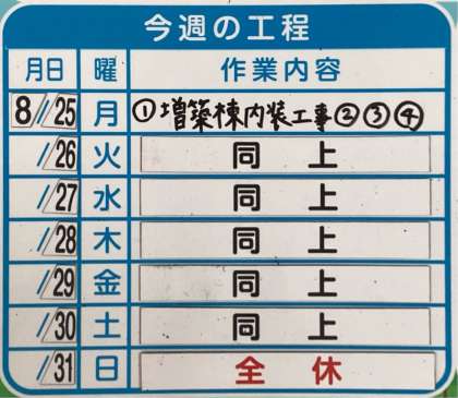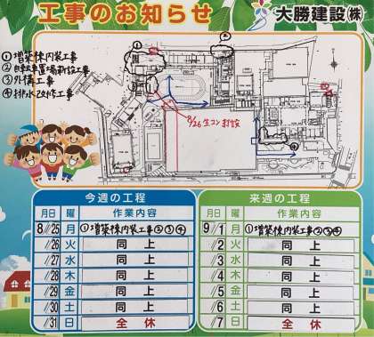 今週(8月25日〜31日)の工事予定 公開日 2025/08/25 更新日 2025/08/25 お知らせ 本校における今週(8月25日〜31日)の工事の予定は「工事のお知らせ」=写真=のとおりです。 いいね(0)