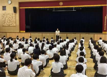 岡学園長先生は「こうしてみんなが元気に登校してくれてうれしいです。夏休み中には、部活動や地域行事、家庭でしっかり過ごせたことと思います。ビーチバレーの全国大会出場に生徒会役員の子ども市会への参加、ジュンク堂書店での文化委員会生徒のPOP作品の展示等もよく頑張りました。」「今年は戦後80年の節目の年。広島・長崎両市などで平和記念式典が開かれましたが、子どもたちが自分の言葉で、平和とは何か、戦争を繰り返さないためにはどうすべきかを真剣に語っていた姿が印象的でした。そのなかで、ある中学生が、平和は特別なことではなく、日々の思いやりや違いを受け入れることから始まる、と話していました。これは学校生活にも当てはまる言葉です」と話し、「2学期は行事も多く、仲間と力を合わせる場面も多い。みんなと力を合わせ、実りのある2学期にしましょう」と呼びかけました。