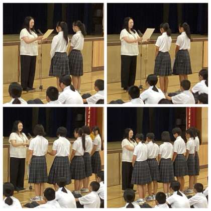 このほか学園長先生は、2学期に6年生を受け持つ古山先生をみんなに紹介。またクラブ活動で活躍した次の団体、個人に賞状などを伝達し健闘をたたえました。