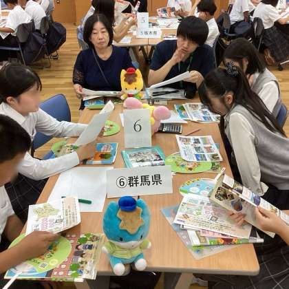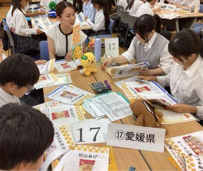この日は7年生76人とOBFの生徒有志45人が会場の多目的ホールに集まり、事前に抽選で割り振られた道県のテーブルに分かれて着席。各テーブルでは、道県大阪事務所の職員を含めて全員で自己紹介し合ったり簡単なゲームをしたりして打ち解け合いました。テーブルには道県のマスコットキャラクターや卓上ミニのぼりなども用意され、にぎやかなムード。生徒たちは、職員から商品の特徴や魅力などを聞いたあと、1チーム3万円の予算でどの商品をいくつ仕入れていくらで売るかを議論し、シートに書き込んでいました。