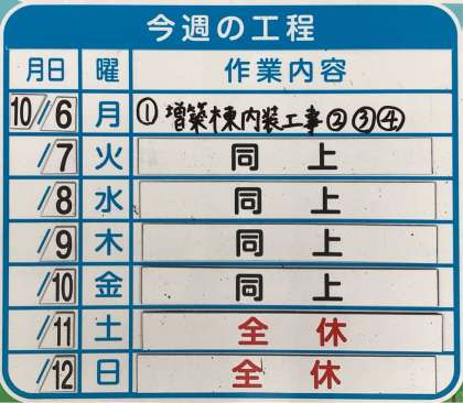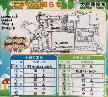 本校における今週(10月6日〜10月12日)の工事の予定は「工事のお知らせ」=写真=のとおりです。
