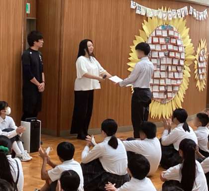 6年生〜9年生の全校集会を10月6日(月)、東館多目的ホールで開き、第34回大阪市立中学校総合文化祭大阪市長杯英語暗唱大会で優れた暗唱を発表した9年生男子生徒に岡学園長先生から表彰状が伝達されました。
