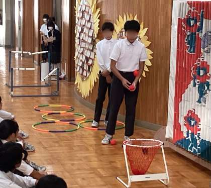 続いて給食委員会が今月の「残さず食べるんやデー」を17日に変更すると発表。最近はご飯やパンの残食が多い傾向が見られ、9月に残食ゼロを達成したクラスは6年生〜9年生9クラスの中で3クラスしかなかったとして、残食ゼロの取り組み強化を呼びかけました。また、生徒会は今月24日の体育大会で行われる生徒会企画の競技「MIRAIランナー」の競技方法について実演しながら説明しました。