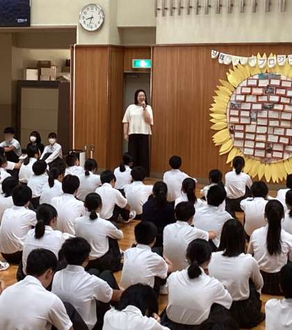 最後に学園長生生から「今日は中秋の名月。月は毎日、形を少しずつ変えながら満月になって行きますが、それは君たちの成長に似ています。成功は一日にしてならずという言葉が表すように、大きな成果は日々の努力の積み重ねの先にあります。体育大会も控えていますが、今週には7年生〜9年生の中間テストがあります。どちらも全力で取り組みましょう」とのお話がありました。
