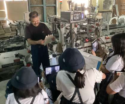 この日は1組〜3組の12人でつくる班が中西紙器工業を訪れました。社長さんは、一例としてクレンジングクリーム用の箱をみんなに見せたあと、印刷されカットされた状態の厚紙を機械にかけ、折り曲げたり糊付けをしたりして箱を完成させる工程を詳しく説明。子どもたちはタブレット端末で動画や写真を撮ったり、紙にメモしたりして真剣に取材していました。一日にどのくらいの数の箱をつくるかという質問には、「多い時で約10万個」との回答があり、驚いていました。
