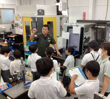 児童10人が訪れたのは山本精工。まず応接室で社長さんらから「金属を削って部品を作る会社で、創業70年」「USJのヨッシー・アドベンチャーという遊具にも我が社の部品が使われています」などと概要を説明いただいたあと、金属を加工する部屋に移動、1000分の1ミリ単位の精度が求められるという、旋盤による円筒状の部品の削り出し作業などを見せていただき、子どもたちはその様子をタブレット端末で丹念に録画していました。応接室に戻ると子どもたちが次々に質問、「作っている部品は約2000種類」「年商は約12億円」などの回答を得ていました=上写真。