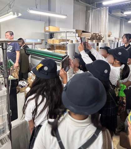 別の児童13人は阿川ランドセルを訪問。生地を加工し裁断するところから完成品にするところまでを一通り見せていただきました。子どもたちは生地の加工前と加工後の違いを、手で触って確かめたり、機械による作業の一部を体験したりもしました。70年前からランドセル一筋で、取扱商品は100種類にも。かわいいキャラクター柄のランドセルもあり、子どもたちも大興奮。たくさんのミシンや見たこともない大きな機械で縫ったり切ったりするところだけでなく、手作業でていねいに作られている様子も見られて自分たちのランドセルが6年間、毎日使っても大丈夫な秘訣を知ることができました=下写真。