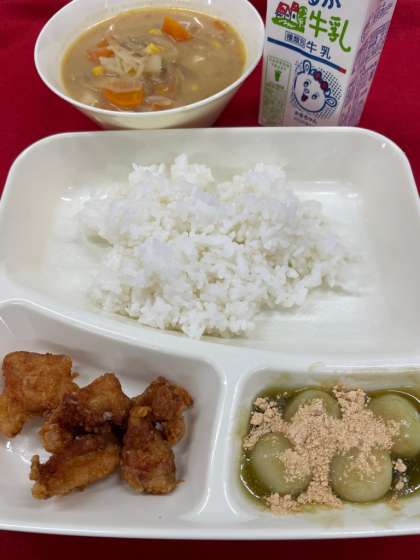 市立横堤中学校の昨年度の家庭科部員が「日本各地の伝統料理を味わうことで旅行に行った気分に」と考案したもので、とり天(大分県)、どさんこ汁(北海道)、抹茶団子(京都府)の3種が組み合わさっています。この日の給食では、これらにごはんと牛乳が付きました。