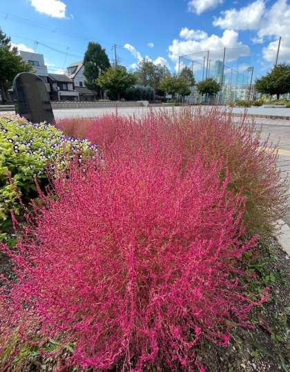 秋が深まり、東館前の花壇のコキアが赤色に染まってきました。