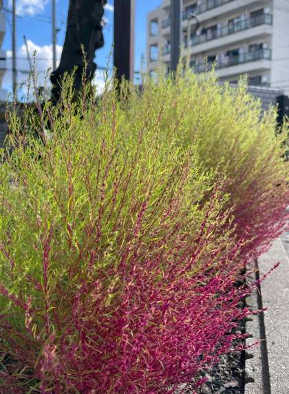 枝葉の形は球形または円錐形ですが、本校のは球形。夏の間は緑色を保っていましたが、秋に入ると徐々に赤く染まり始め、全体が真っ赤になった株が見られるようになりました=上写真。中には紅葉し始めで、下部だけが赤くて上部はまだ緑色というグラデーションタイプもあります=下写真。