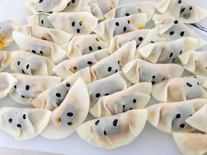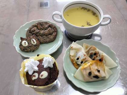 メニューは、おばけ餃子、かぼちゃスープ、ガトーショコラ、黒ゴマクッキーです。