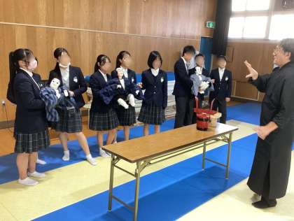 講師は来月9日(火)に本校で、福の神とされる恵比寿(えびす)様が大漁や商売繁盛などを願ってタイを釣る「えびす舞」を上演していただく淡路人形座(南あわじ市)の座員のみなさん。9年生はその公演で人形遣いと語りの一部を担うことになっており、この日はその練習の場です。