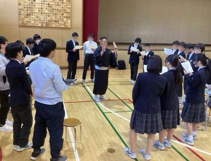 日本の伝統芸能の一つ・人形浄瑠璃のワークショップが東体育館で行われ、9年生が人形遣(つか)いと語りの稽古(けいこ)に取り組みました。