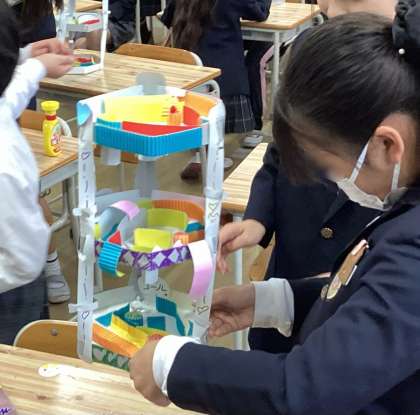 4年生がこのほど、図工の授業で、厚紙や段ボールなどを使って立体的な迷路をつくりビー玉を転がして遊びました。