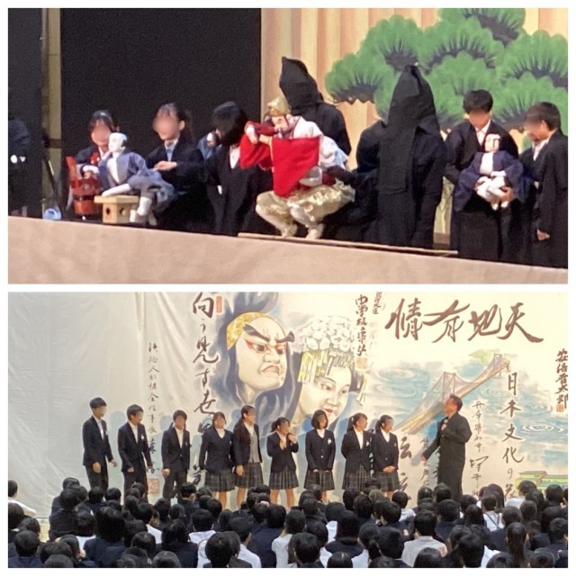 日本の伝統芸能である人形浄瑠璃の公演が12月9日(火)、東体育館であり、6年生〜9年生が鑑賞、9年生は共演も果たしました。