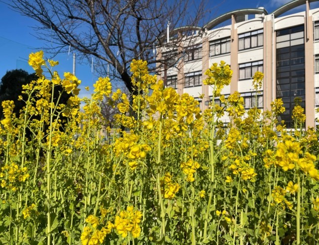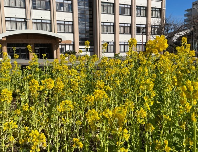 東館前の花壇で菜の花が咲き、鮮やかな黄色の花の帯が冬の荒涼とした花壇周辺の雰囲気を明るくしています。