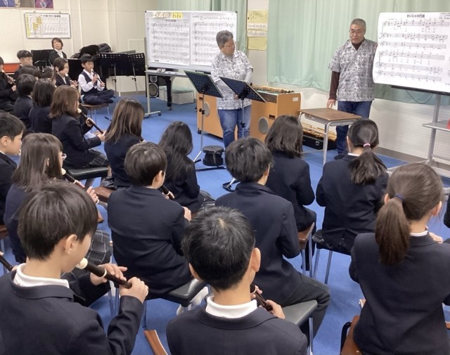 続いて子どもたち全員が、それぞれ自分のリコーダーを手にしてアメリカ民謡でジャズの名曲「聖者の行進」の2部合奏に挑戦、きれいな音色を響かせました。