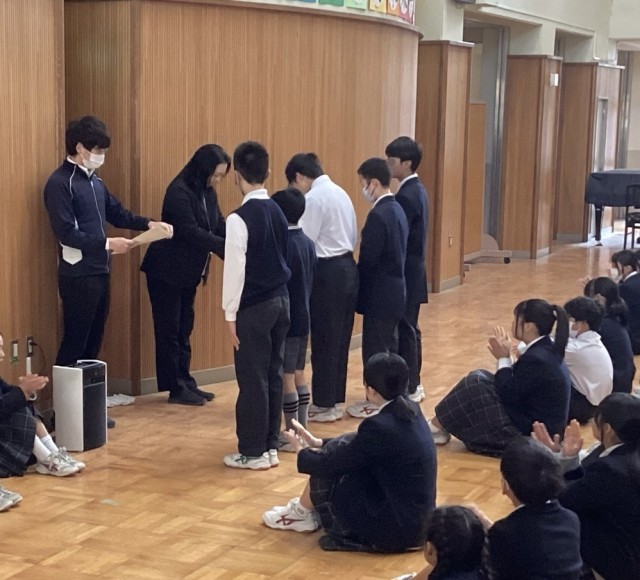 2月2日(月)、6年生〜9年生の全校集会を東館多目的ホールで開き、学校給食週間にちなんだ「ノー残食Week」の取り組みで優れた成績を挙げた次のクラスの代表に岡学園長先生から表彰状が贈られました。