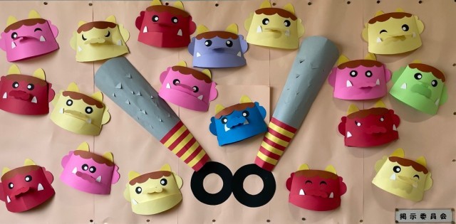 節分の日には厄除けや無病息災を祈ってイワシや炒(い)った大豆を食べる風習があります。これにちなみ、この日の給食には「いわしのしょうがじょうゆかけ」と「福豆」と書かれた小袋入りの炒り大豆が出され、豚肉と野菜の含め煮、ごはん、牛乳が付きました。おいしくいただきました=下写真は節分がテーマの掲示委員会の作品。
