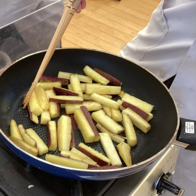 授業のテーマは幼児のおやつ。5人ずつの班に分かれて調理台を囲み、サツマイモをスティック状に切る作業から開始。これを油を敷いたフライパンで焼いて一度取り出したあと、砂糖としょうゆ、みりんを混ぜたたれを煮詰め、その中に投入して再加熱しました。