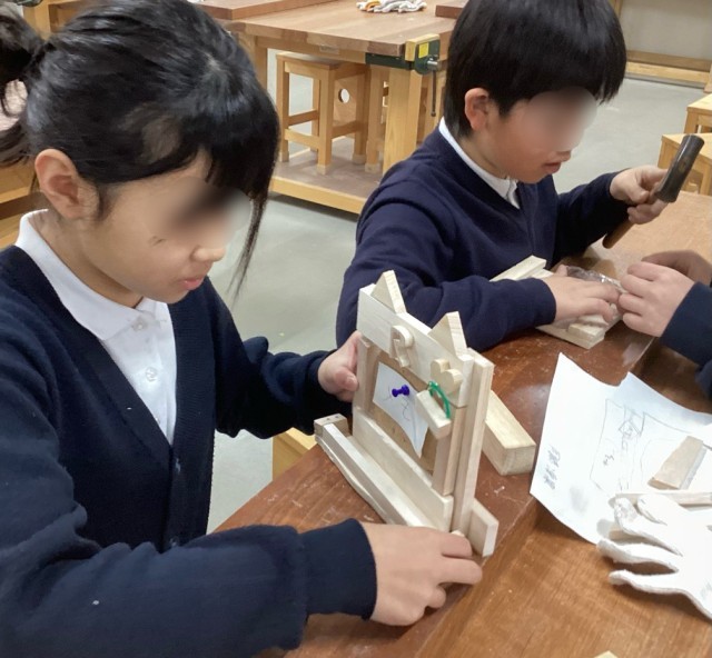 4年生がこのほど、東館木工室で木工作品づくりに取り組みました。