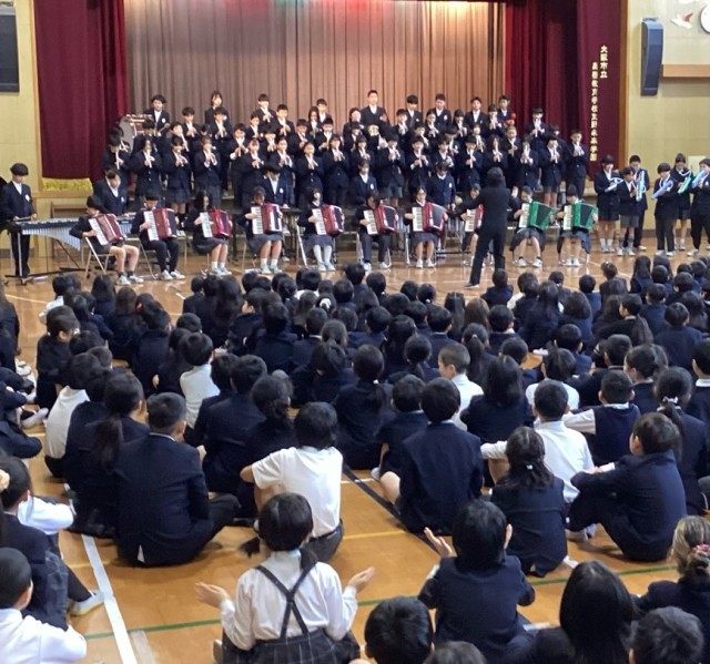 6年生たちは、今月18日に修了証書を授与され4月から後期課程に進みますが、私学など別の学校に進む子もいることから「このメンバーで合奏できるのは今日が最後。みんなの気持ちを一つにして一生懸命演奏します」とあいさつして演奏を開始。アコーデオンやリコーダー、鍵盤ハーモニカ、鉄琴などの楽器で明るくてきれいなハーモニーを奏で、時おり「テキーラ!」と声も上げて、場を盛り上げました。