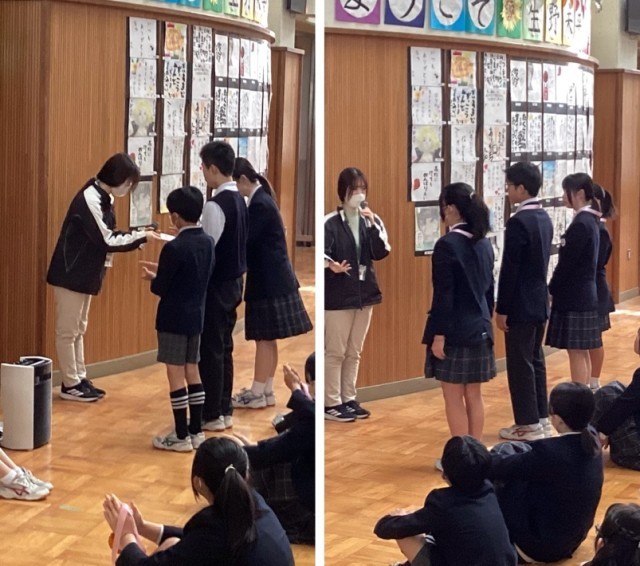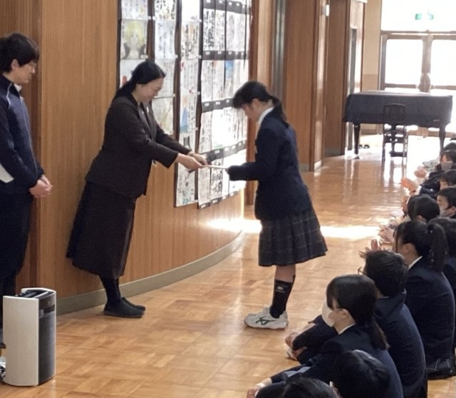 6年生〜9年生の全校集会が3月9日(月)、東館多目的ホールであり、令和7年度歯・口の健康に関する図画・ポスターコンクール(大阪市学校歯科医会主催)で入選した6年生女子に岡学園長先生から表彰状が伝達されました=上写真。
