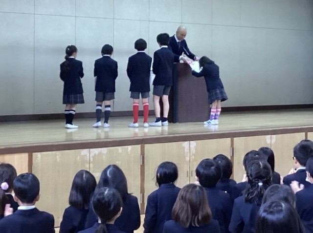 1年生〜5年生の今年度修了式を3月23日(月)、東体育館で行い、小濱准校長先生から各学年の代表児童に修了証が手渡されました=上写真。