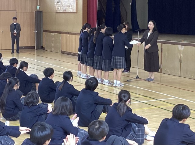 式に先立って令和8年度前期生徒会役員に選ばれた6人の認証式があり、岡学園長先生から会長、副会長、執行役員の順に認証状が手渡されました=上写真。続いてバレーボールの大阪市第4支部女子1年生大会で優勝した女子バレーボール部に表彰状が伝達されました=中写真。