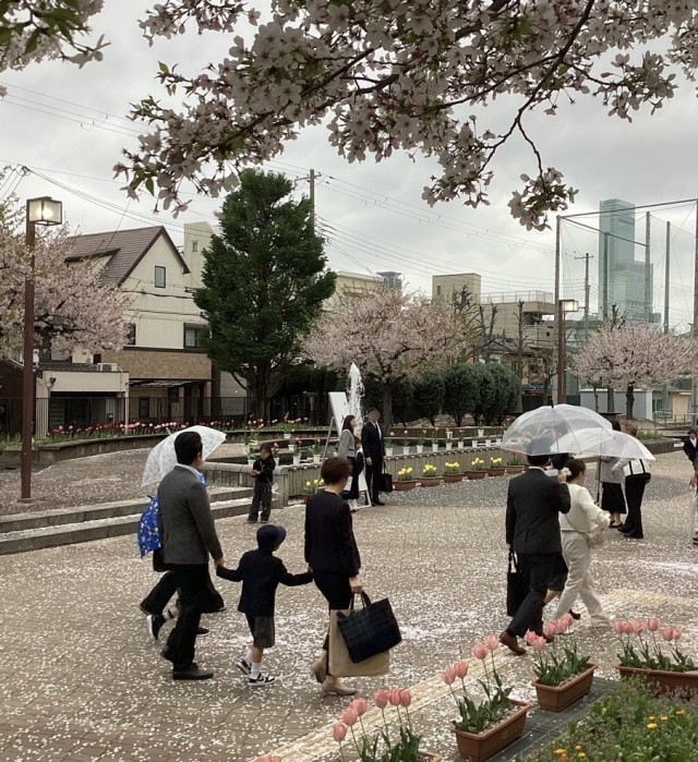 小雨混じりの風で桜吹雪が舞うなか、真新しい制服に身を包んだ1年生たちが保護者に連れられて次々に登校=上写真。