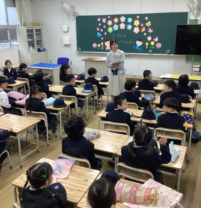 式が終わると自分の教室に入ってクラスメートを確認し合い、担任の先生のお話を聞きました。1年生たちは、これから始まる学校生活に胸をおどらせている様子でした=下写真。