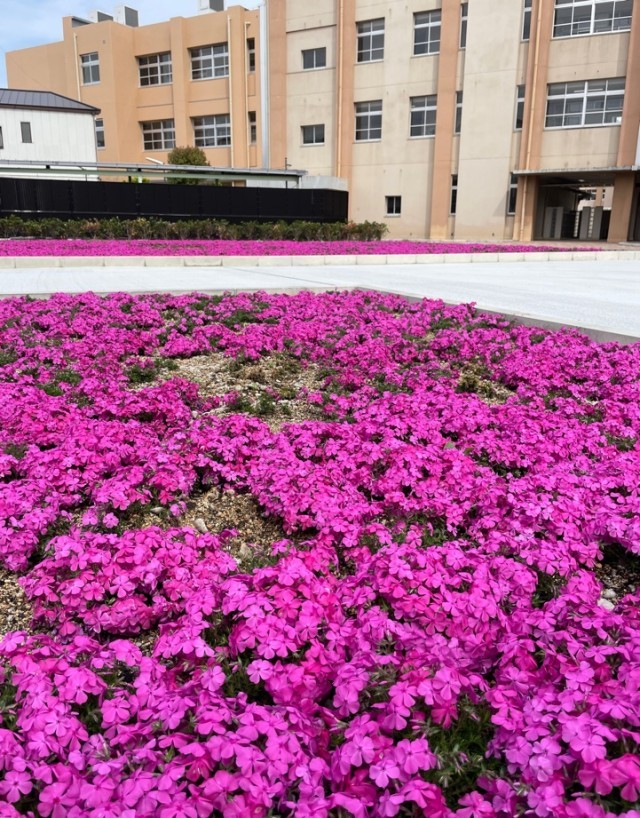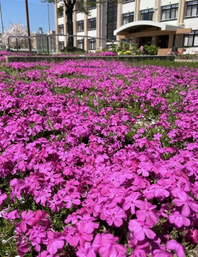 正門近くの花壇と西門近くに新設された花壇にシバザクラが咲き、赤紫色のじゅうたんが出現、華やかな雰囲気を漂わせています。