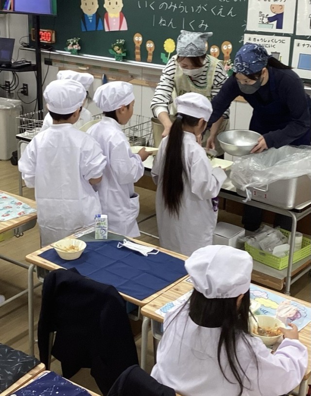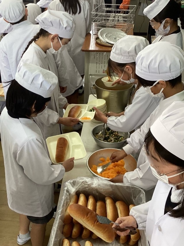 給食が始まった4月9日(木)、入学したばかりの1年生たちは、5年生たちに配膳してもらって初めての給食を楽しみました。