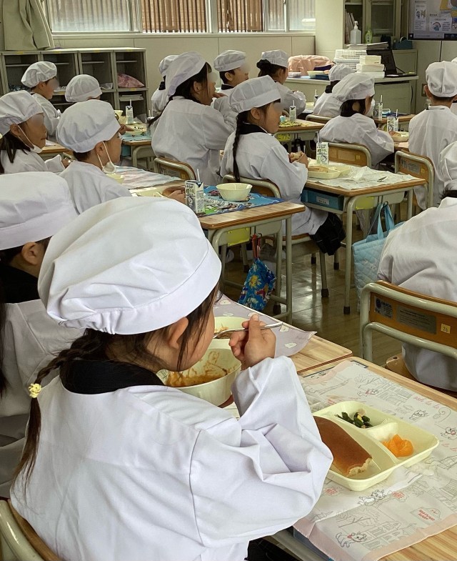 1年生が初めての給食 5年生の配膳でシチューなど楽しむ