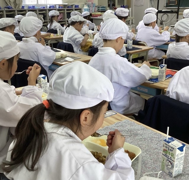 カツレツは、語呂合わせで「勝つ」に通じることから、祝い事の食事によく使われます。カレーは子どもたちの超人気メニュー。みんな楽しそうにスプーンを動かしていました=下写真は1年生。