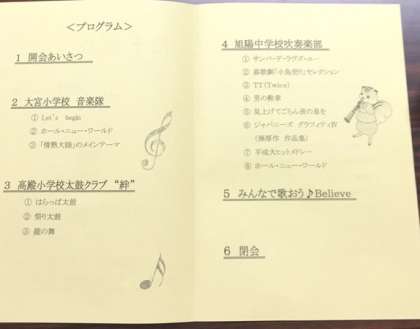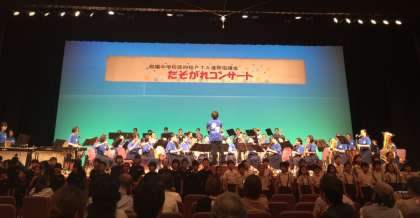 旭陽中学校区四校PTA連絡協議会主催で、高殿小学校太鼓クラブ”絆”、大宮小学校音楽隊、旭陽中学校吹奏楽部が出演しました。最後に「みんなで歌おう♪Believe」で合唱し大盛況でした。