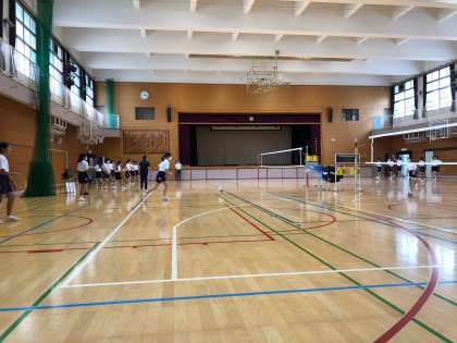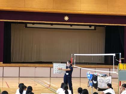単元は「バレーボール」です。ホワイトボードを活用し、取り組み内容をわかりやすく説明していました。最後はそれぞれがチームに分かれて、しっかり取り組むことができていました。