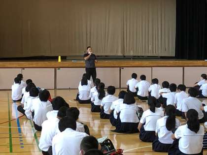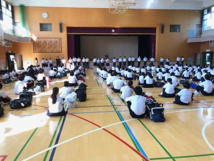 その後、修学旅行実行委員の生徒たちが前に立ち、修学旅行の決意を述べました。ルールを守り、感染予防に気をつけて、みんなで充実したすばらしい修学旅行にしましょう!