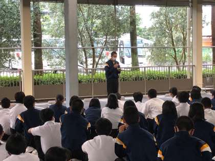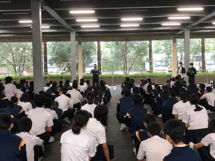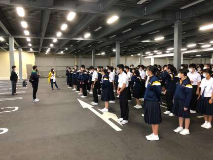 朝のつどいです。あいにくの天候で、屋内駐車場で行っています。