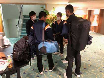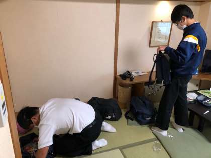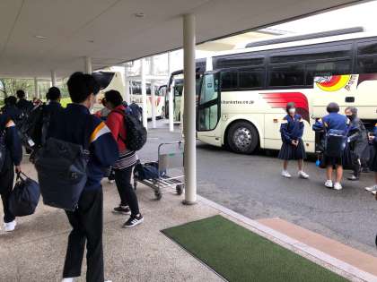 朝のつどい後、退館準備を行い、大きな荷物をバスに運んでいます。