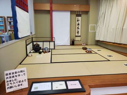 今年はコロナの影響でお茶会を開催できませんでした。掲示を作成したり、図書室の畳の間にお茶室を作ってみました。「わびさびの心」を感じてもらえたでしょうか。