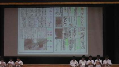 体育館では、各学年の平和学習の取り組みを発表し、平和を祈りました。