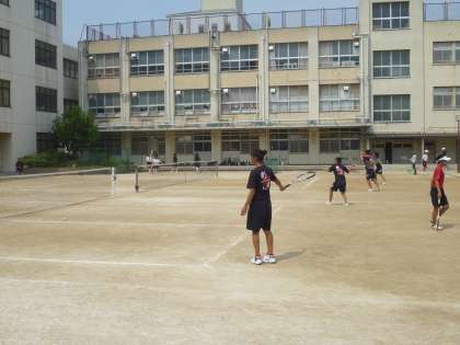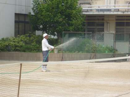 ソフトテニス部は早朝から白球を追い続けています。地面から立ち上る熱風を少しでも和らげようと顧問の先生もホースでコートに水を撒いていますが、一瞬で乾いてしまいます。