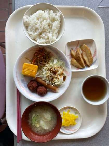 朝食のメニューはミートボール、卵焼き、フライドポテト、きんぴらごぼう、ウインナー、ごはん、白菜味噌汁でした。