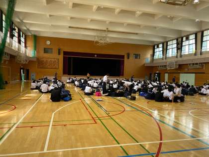 荷物点検で忘れ物がないかの確認をして、出発するにあたって、注意する点を再確認しました。体験学習から自然の素晴らしさを感じ、平和学習を通して、いままでとこれからを考え、仲間との交流を深める修学旅行としていきましょう。