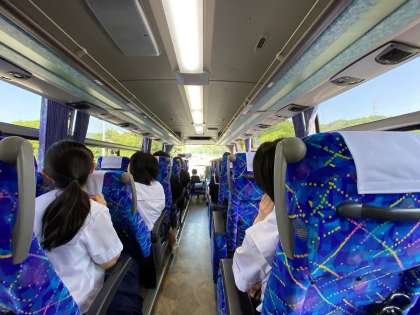 各学級で考えた音楽CDやバスレクリエーションの映像を聞いて楽しく過ごしています♪