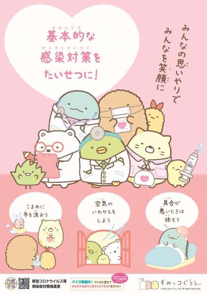 内閣官房・新型コロナウイルス等感染症対策推進室より、主に若年者層に向けた、基本的な感染対策を分かりやすく周知する「すみっコぐらし感染対策ポスター」が作成されました。