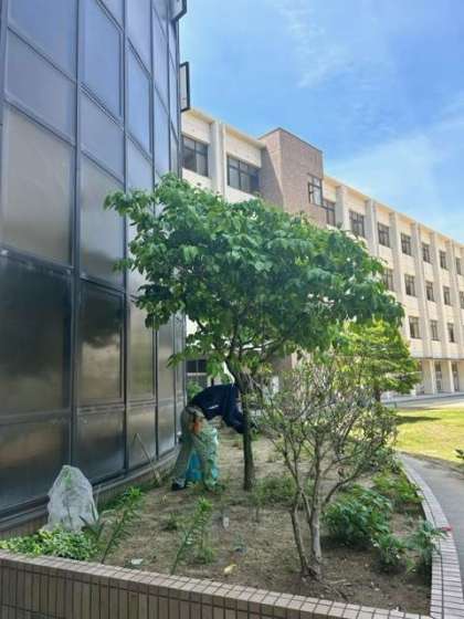 学校元気アップ事業の方々の様子を撮らせていただいた後に、中庭では、管理作業員さんが剪定作業をおこなっていました。