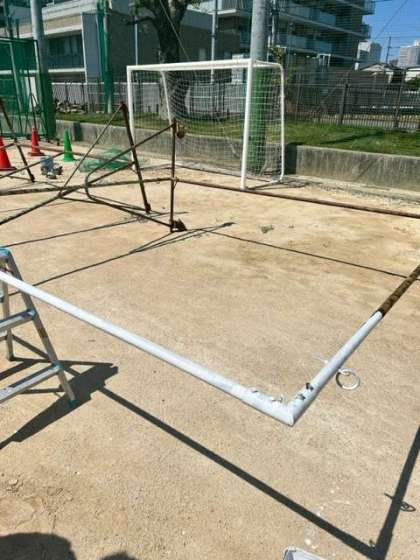 管理作業員の方々が、連日防球ネットの改修作業をおこなっています。