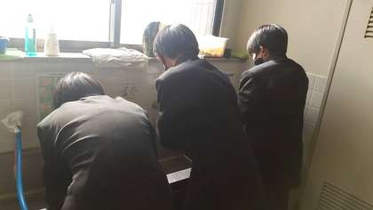 職員室横に設置されている水槽の清掃を丁寧にしています。